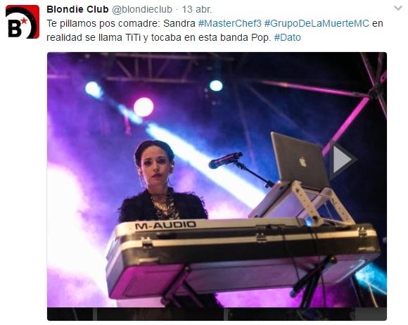 Hace un par de semanas, la cuenta oficial en Twitter de la discoteque “Blondie” (@blondieclub) publicó una imagen de Sandra tocando en uno de sus eventos. “Te pillamos pos comadre: Sandra #MasterChef3 #GrupoDeLaMuerteMC en realidad se llama TiTi y tocaba en esta banda Pop”, decía el mensaje.