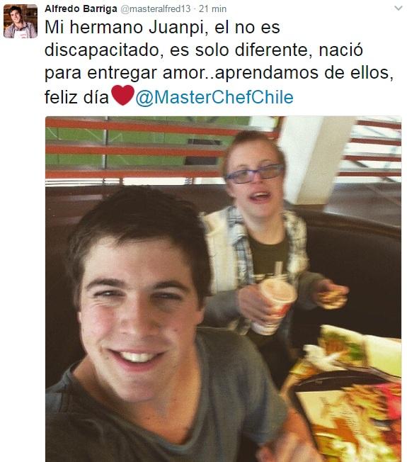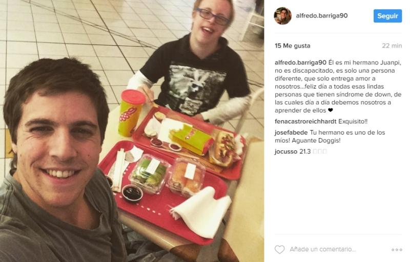 “Él es mi hermano Juanpi, no es discapacitado, es sólo una persona diferente, que solo entrega amor a nosotros…Feliz día a todas esas lindas personas que tienen síndrome de down, de las cuales día a día debemos nosotros aprender de ellos”, escribió Barriga en su publicación.