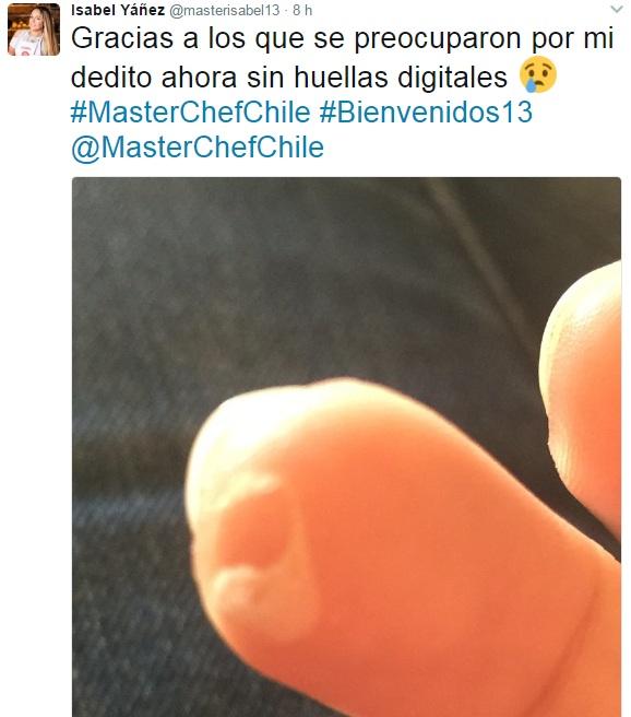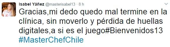 A través de su cuenta oficial de Twitter (@masterisabel13), Yáñez mostró las consecuencias del accidente que sufrió en el duelo de eliminación.