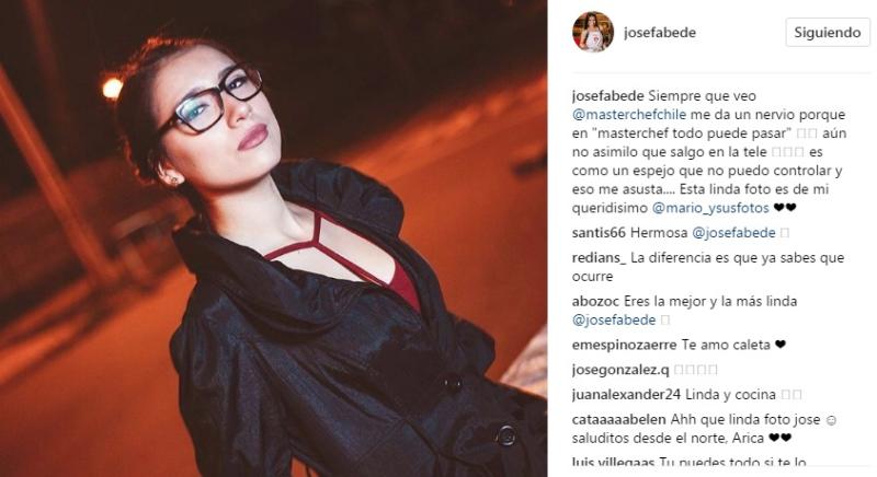 “Siempre que veo MasterChef Chile me da nervio porque ‘en MasterChef todo puede pasar’ (…) Aún no asimilo que salgo en la tele…Es como un espejo que no puedo controlar y eso me asusta”, escribió la joven en su cuenta oficial de Instagram (@josefabede).