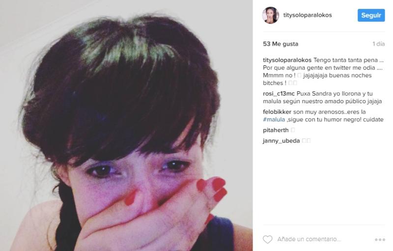 “Tengo tanta pena…Porque alguna gente en Twitter me odia…Mmm no! Jajajajaja Buenas noches bitches”, escribió la también cantante, la cual aprovechó de subir una imagen de ella dando cuenta de "su tristeza".