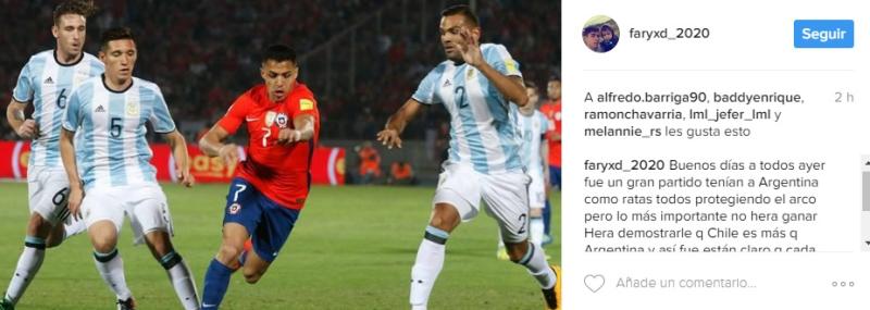 “Ayer fue un gran partido, tenían a Argentina como ratas, todos protegiendo el arco. Pero lo más importante no era ganar, era demostrarle que Chile es más que Argentina y así fue”, escribió Faryd.