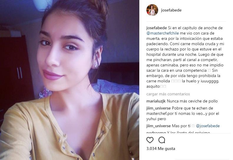“Si en el capítulo de anoche (miércoles) de @masterchefchile me vio con cara de muerta, era por la intoxicación que estaba padeciendo”, escribió la joven en su cuenta oficial de Instagram (@josefabede).