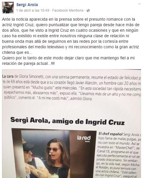 Se trata de uno de los rumores que marcó la industria del espectáculo chileno en los últimos días. El supuesto romance de Sergi Arola, integrante del jurado de “MasterChef Chile”, con la actriz Ingrid Cruz, conocida por sus roles en teleseries como “Marparaíso”, "Machos" y “Brujas”. Esto tras la difusión de unas fotos en las que aparecían juntos.