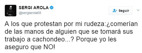 “A los que protestan por mi rudeza: ¿comerían de las manos de alguien que se tomará sus trabajo a cachondeo...? Porque yo les aseguro que NO!”, escribió Arola luego del último capítulo del espacio televisivo.