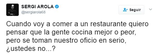 A través de su cuenta oficial de Twitter (@sergiarola68), el experto gastronómico dejó en claro el objetivo de sus críticas en esta tercera y exigente temporada del programa de cocina más exitoso de Chile.