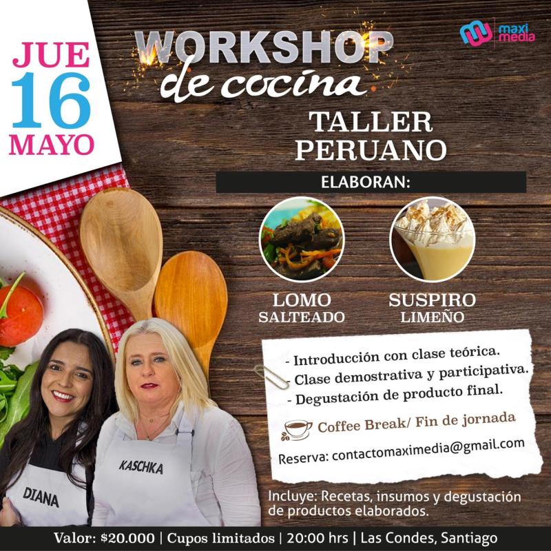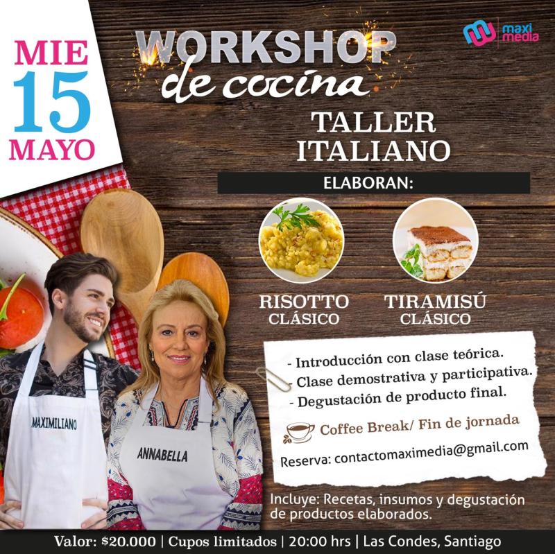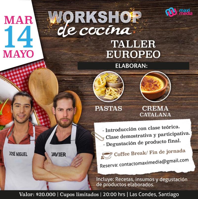 ¡Participantes del programa de cocina más importante del mundo te tienen una gran invitación! Maximiliano y Javier han ideado realizar su primer "workshop" de cocina junto a algunas parejas de MasterChef Chile en su cuarta temporada. Las fechas son el 14, 15 y 16 de mayo, para aprender de gatronomía peruana, italiana y comida europea. El valor por persona es de $20.000 pesos y para asegurar tu cupo debes escribir a: contactomaximedia@gmail.com.