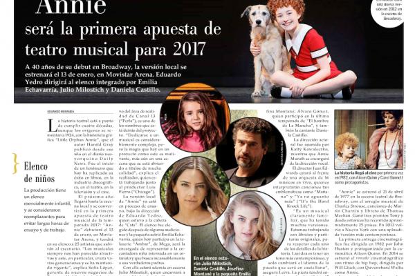 Los actores de esta producción serán Julio Millostich, como el multimillonario Oliver Warbucks; Carmen Gloria Bresky como la señorita Hannigan; Daniela Castillo como Grace Farrel; Josefina Montané como Lily St. Regis; Alvaro Gómez como Rooster Hannigan y en el papel principal de Annie, estará Emilia Echavarría.