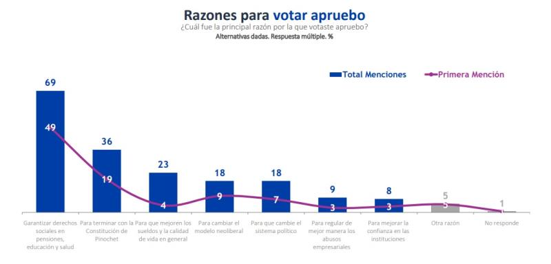 Dentro de las principales razones para decidir por la opción Apruebo, los encuestados declararon que en un 49% se debe al deseo de "garantizar derechos sociales en pensiones, educación y salud", seguidos por terminar con la Constitución de Pinochet (19%) y cambiar el modelo neoliberal (9%).