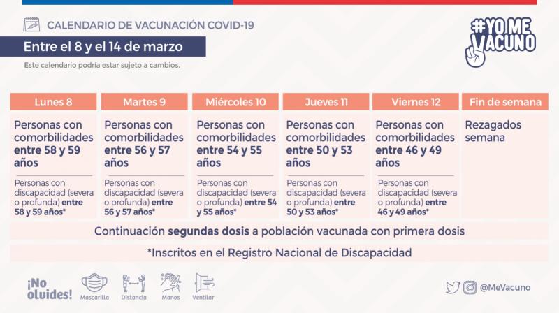 Viernes 12 de marzo: Personas con comorbilidades entre 46 y 49 años y personas con discapacidad (severa o profunda) inscritos en el Registro Nacional de Discapacidad entre 46 y 49 años.