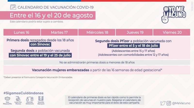 De esta forma, el 16 y 17 de agosto se inocularán primeras dosis con Coronavac a mayores de 18 años, y segundas dosis a personas vacunadas entre el 19 y 25 de julio pasado, también con la fórmula de Sinovac.