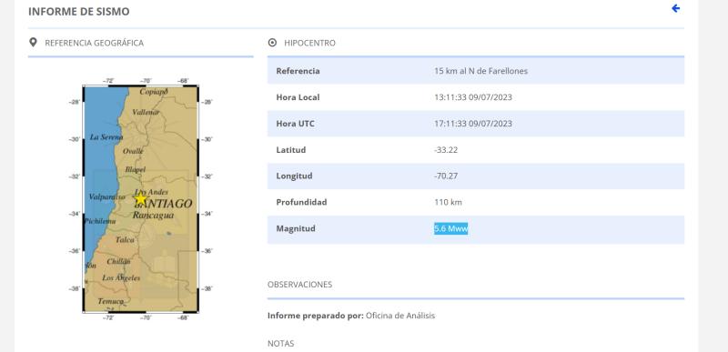 Según información actualizad Centro Sismológico de la Universidad de Chile, el sismo tuvo una intensidad de 5.6 Mww, mientras que el epicentro fue a 15 km al NE de Farellones. Cabe señalar que esta información se actualizó de la preliminar (de 5.3).