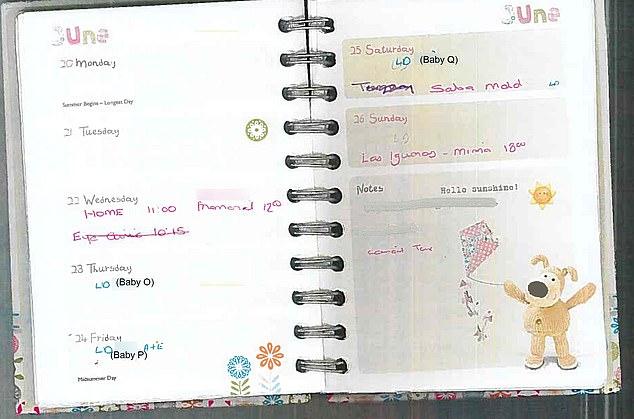 También mantuvo esta agenda colorida, en el que escribe los registros de algunas de sus víctimas. Letby afirmó que los papeles y registros no eran importantes para ella, y solo lo hacía "porque recogía papel".