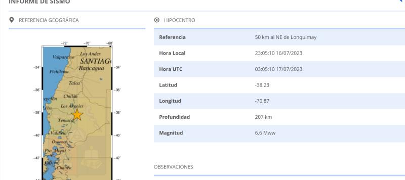 Según han reportado medios argentinos, como MDZ, el sismo tuvo un epicentro de una profundidad de 215 kilómetros y se ubicó en la localidad de Loncopué, en Argentina.