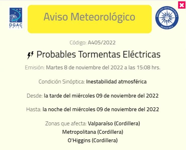 En el anuncio se informa que las zonas afectadas serán Valparaíso, Metropolitana y O'Higgins, principalmente en la zona cordillerana.