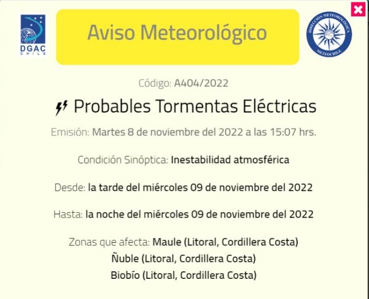 La Dirección Metereológica de Chile (DMC) dio aviso este martes 8 de noviembre de probables tormentas eléctricas en zonas de seis regiones del país.