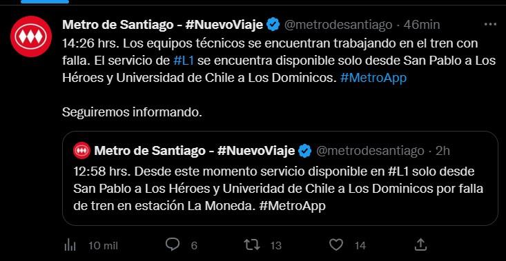 "Desde este momento servicio disponible en #L1 solo desde San Pablo a Los Héroes y Univeridad de Chile a Los Dominicos por falla de tren en estación La Moneda. #MetroApp", informó Metro en Twitter.
