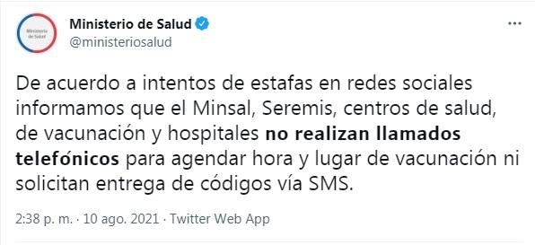 “De acuerdo a intentos de estafas en redes sociales informamos que el Minsal, Seremis, centros de salud, de vacunación y hospitales no realizan llamados telefónicos para agendar hora y lugar de vacunación ni solicitan entrega de códigos vía SMS”, expresaron a través de un mensaje en la cuenta de Twitter oficial del Ministerio de Salud.