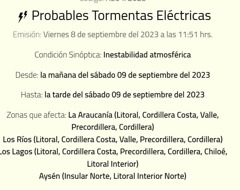 La DMC mantiene además un aviso por tormentas eléctricas para el este sábado en estas regiones del sur: La Araucanía, Los Ríos, Los Lagos, y Aysén.