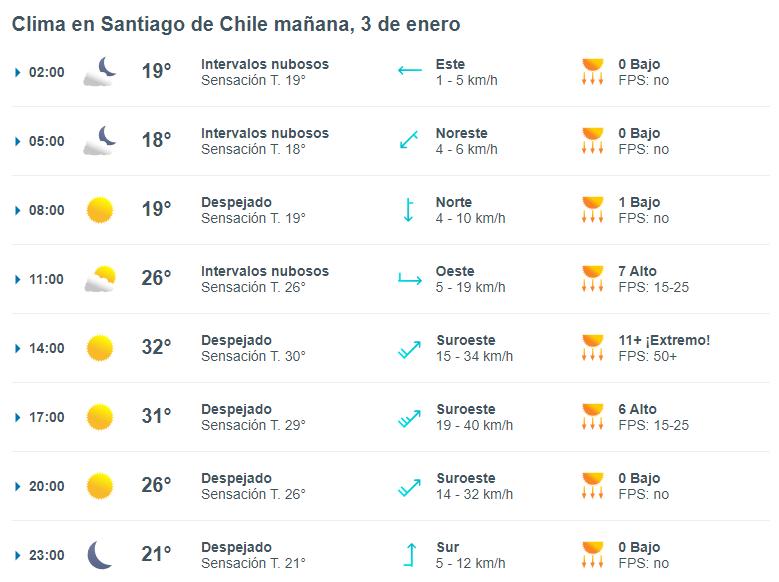 Después de las 17:00 horas, y con el cielo totalmente despejado, el pronóstico del tiempo en Santiago indica que la temperatura bajará paulatinamente después de las 18:00 horas, donde el termómetro caerá a 26° y luego a 21° antes de la medianoche.