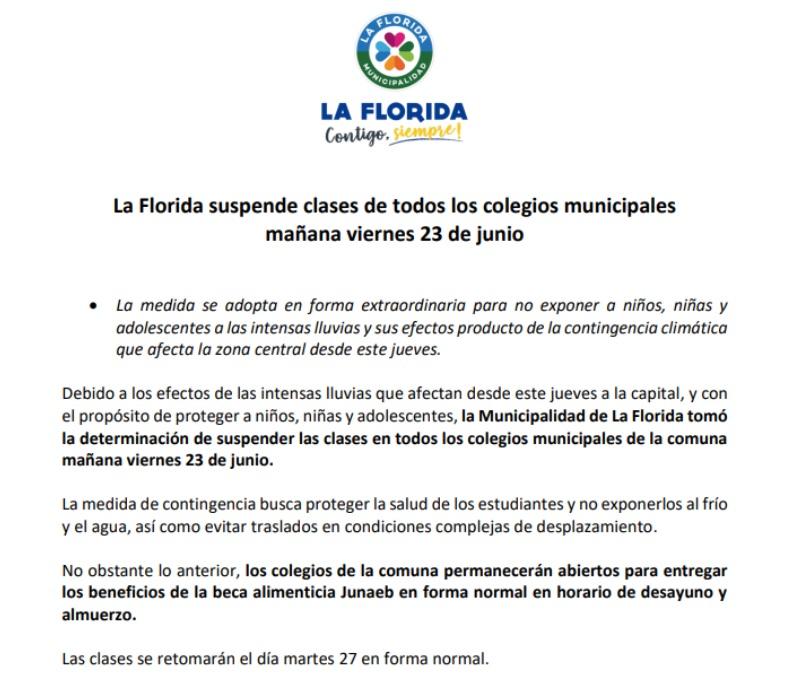 De acurdo a la información entregada por la Municipalidad de La Florida a través de un comunicado, se señaló que "la medida de contingencia busca proteger la salud de los estudiantes". Asimismo, explicaron que las clases se retoman con normalidad el próximo martes 27 de junio.