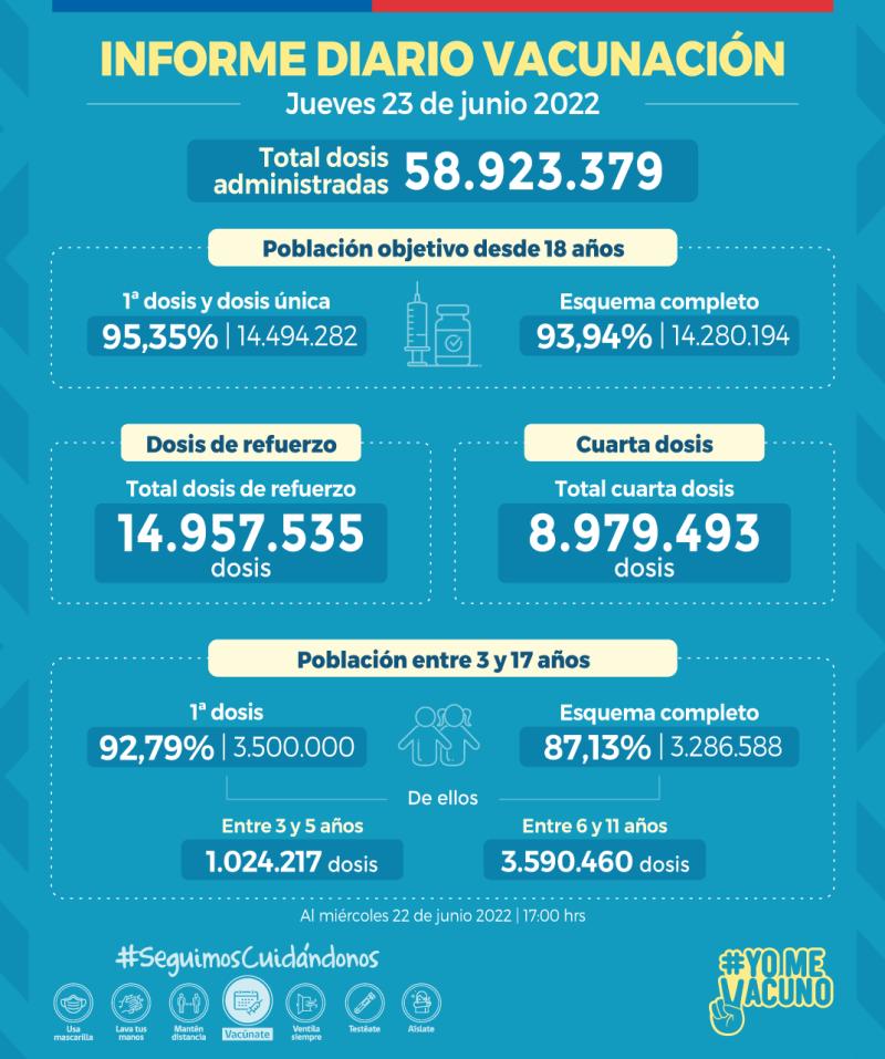 Con fecha de corte de miércoles 22 de junio, de acuerdo a los datos del Departamento de Estadísticas e Información de Salud, se han administrado en el país 58.923.379 dosis de vacuna contra el Covid.