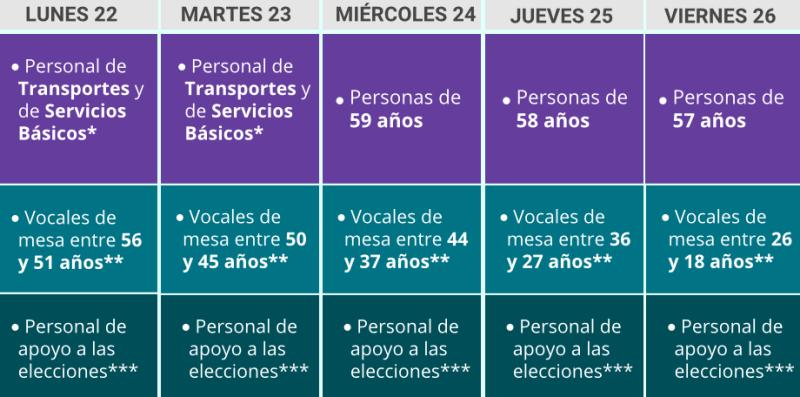 Quienes hayan sido seleccionados como vocales de mesa tendrán la posibilidad de vacunarse de manera preferente contra el COVID-19 durante la próxima semana, según el calendario. De esta forma, podrán recibir la primera dosis de inoculación entre el lunes 22 y viernes 26, dependiendo el día de su edad.