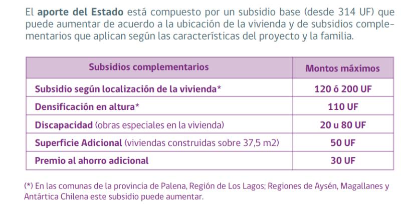 Tiene una base de 314 UF, al que se le añaden subsidios complementarios dependiendo de la vivienda, llegando hasta los 950 UF (unos 32 millones de pesos).