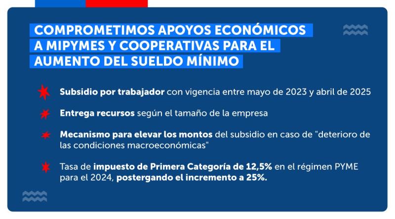 La ley contempla un subsidio para las pymes, el que irá aumentando con las respectivas alzas programadas (mayo, septiembre y julio de 2024). El monto de este subsidio variará de acuerdo a si se trata de una micro, pequeña o mediana empresa; y de otras características.