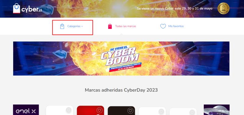 Para revisar las marcas por categoría, dirígete en el menú principal y haz clic en la sección "Categorías". Luego, haz clic en la opción que estés buscando.