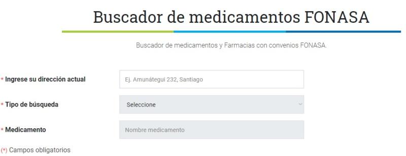 - Una vez en el sitio web de Fonasa, ingrese su dirección actual, el tipo de búsqueda (nombre, principio activo o acción terapéutica), y el nombre del medicamento.