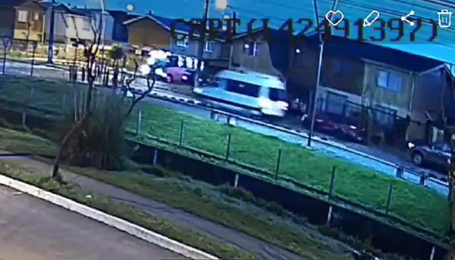 Según el registro de una cámara de seguridad del sector, el furgón escolar es alcanzado por un microbús de la Línea Cóndor al llegar a la esquina de la intersección, donde se encuentar un ceda el paso y un signo Pare.