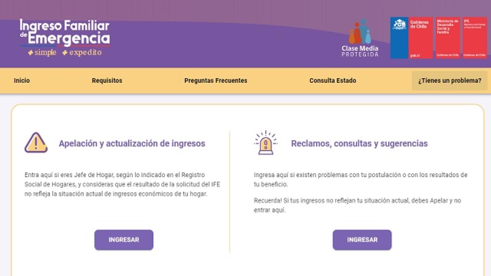 Para esto, se debe ingresar al sitio web del Ingreso Familiar de Emergencia, y seleccionar la opción “¿Tienes un problema?”. Este sistema permite ingresar dos tipos de requerimientos: Apelación o Reclamo.