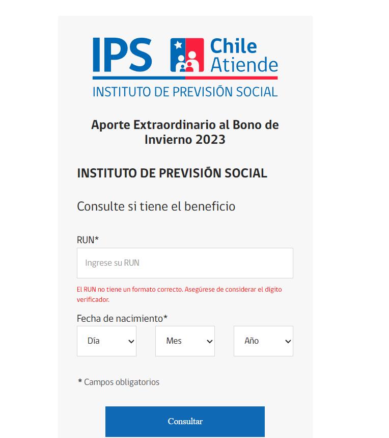 Para consultar con tu RUT si recibes el segundo pago del Bono Invierno, puedes dirigirte a la página dispuesta por el IPS (clic aquí) y consultar ingresando tu RUT y fecha de nacimiento.