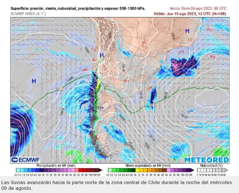 El sistema frontal avanzará hacia norte. Llegará la tarde noche del miércoles con precipitaciones en la Región del Maule y la madrugada del jueves a la Región de O'Higgins.