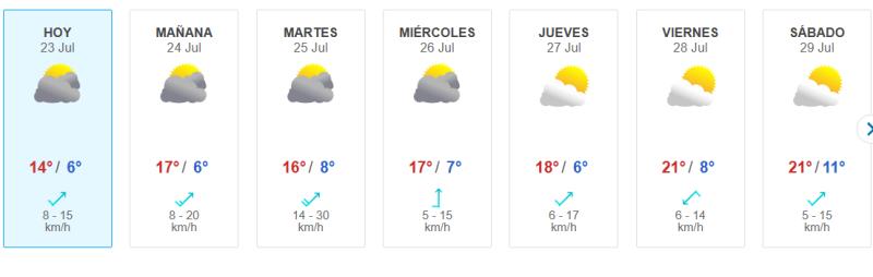 El martes, se espera que la mínima llegue a los 8°C y la máxima a los 16 grados °C; el miércoles, la mínima a los 7°C y la máxima a los 17°C.
