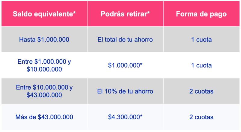 De acuerdo al proyecto de ley, se establece que el monto mínimo a retirar será de 35 UF (1 millón de pesos) y el monto máximo será equivalente a 150 UF (4,3 millones de pesos aproximadamente).