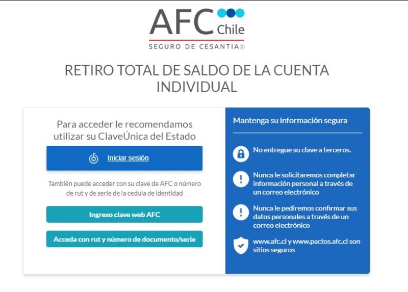 - Una vez en el sitio web de la AFC, ingrese con su Clave Única o RUT y clave de acceso personal. Si no tiene una, se puede crear una cuenta
