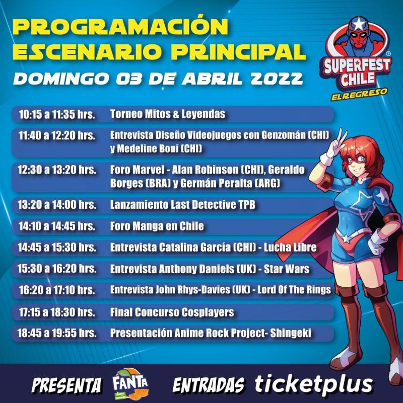 Si quieres participar en el evento que se realiza en el Espacio Riesco, también debes conocer el extenso programa de actividades que involucra a grandes invitados internacionales, y artistas nacionales emergentes y consagrados, además de torneos de cartas, conversatorios, encuentros con los fans, esculturas, etc.