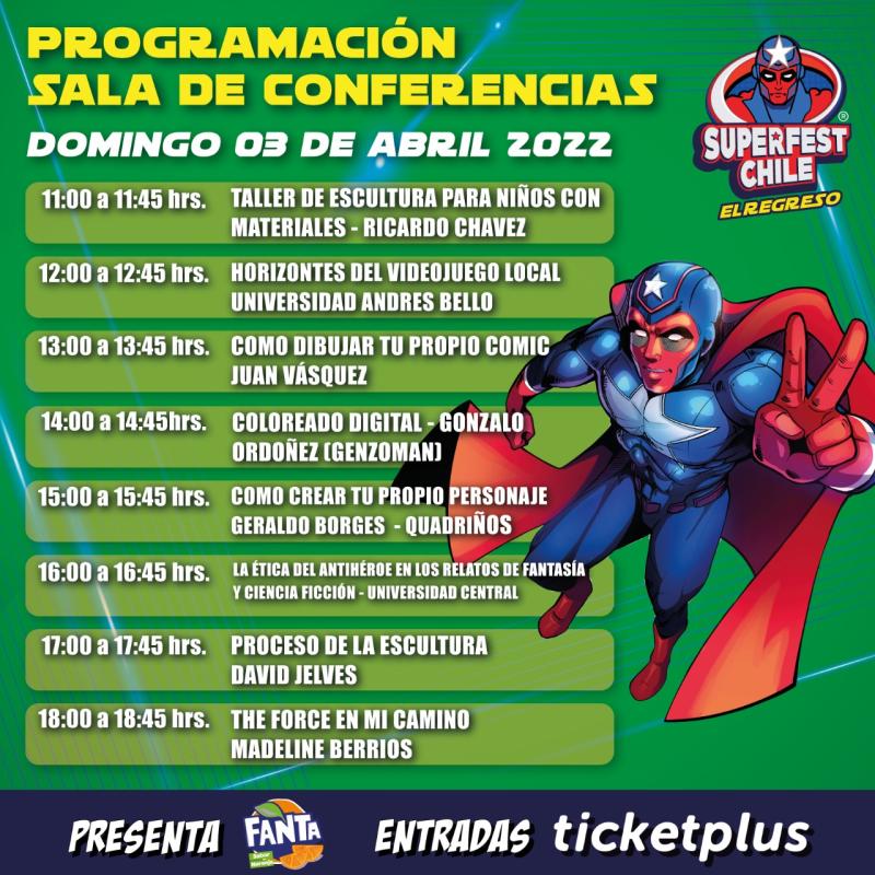 Pero este espectacular programa tendrá su broche de oro este domingo 3 de abril, en la jornada de clausura de SuperFest Chile. En la sala de conferencias del Espacio Riesco podrás acceder a valioso material audiovisual, además de clases y talleres.