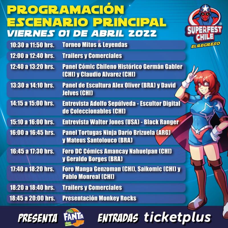 El gran evento inicia hoy, viernes 1 de abril, con el plato fuerte de la jornada a eso de las 15:00 horas, cuando el Black Ranger original, de "Mighty Morphin Power Rangers", Walter Jones, pase al escenario principal para compartir con los fanáticos de la inolvidable serie.