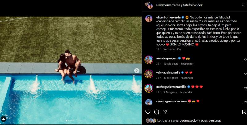 "No podemos más de felicidad, acabamos de cumplir un sueño. Y este mensaje es para todo aquel soñador. Jamás bajar los brazos, trabaja duro para conseguir tus metas, todo es posible en esta vida, lucha por lo que quieres y tarde o temprano todo dará fruto. Pero por sobre todas las cosas jamás olvidarte de tus inicios y de todo lo que tuviste que pasar para lograrlo. Gracias a todos siempre por su apoyo SON LO MÁXIMO", escribió Oliver.