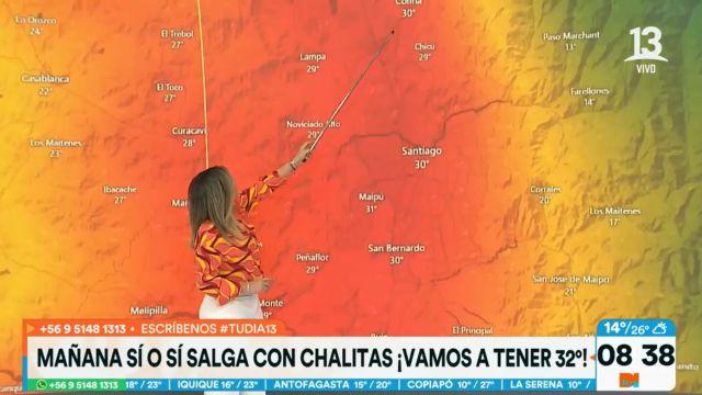 Respecto a las altas temperaturas que se vienen para los próximos días, concretamente para este jueves 23 de noviembre, Michelle Adam adelantó que "en el centro de Santiago se espera una máxima de treinta grados, pero en comunas como Lampa, Colina, Tiltil, los termómetros podrían alcanzar 31,5° o hasta los 32°".