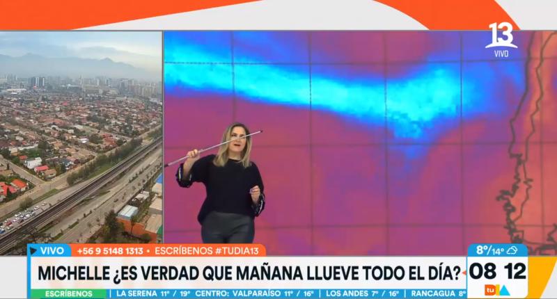 Por esto, se encendió la duda respecto hasta qué hora lloverá, a lo que Michelle indicó que "debería llover en Santiago durante gran parte del día. Desde la mañana hasta la noche. Es más, se puede extender esto hasta la madrugada del día jueves".