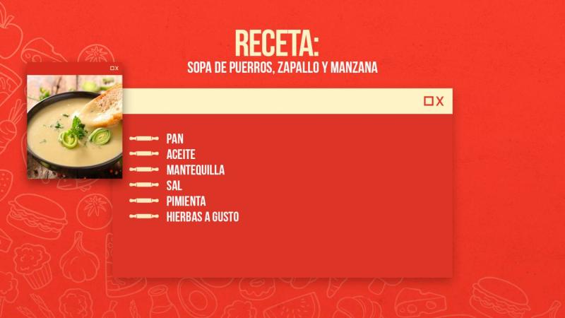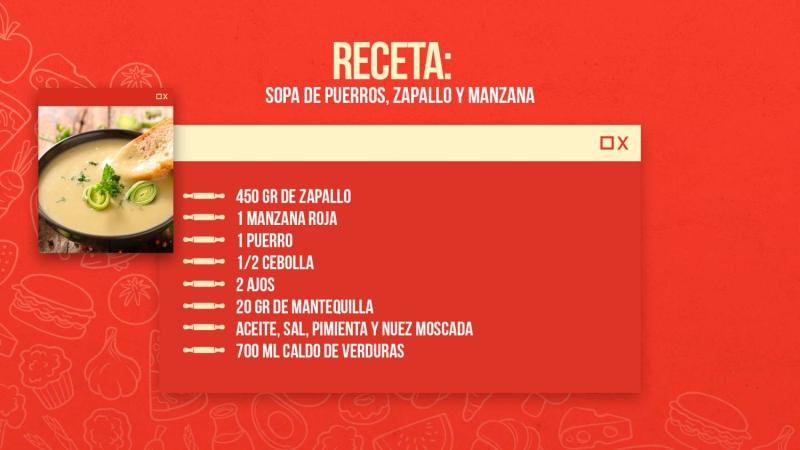 En esta oportunidad la receta que nos enseñaron a preparar, junto al gentil auspicio de Del Valle, fue una deliciosa sopa de puerros, zapallo y manzana, y para ello necesitas los siguientes ingredientes: