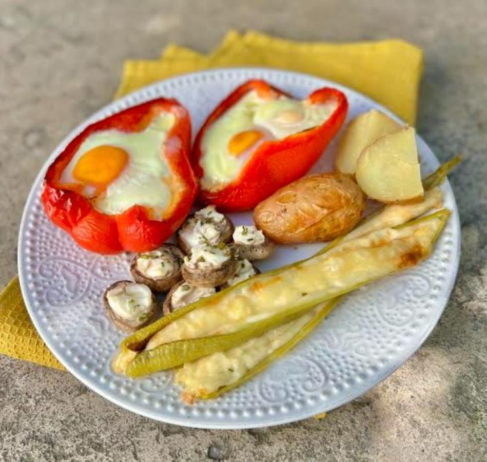 4. Rellena cada mitad del pimentón con 1 huevo y cada mitad de ají con los cubitos de queso mantecoso.