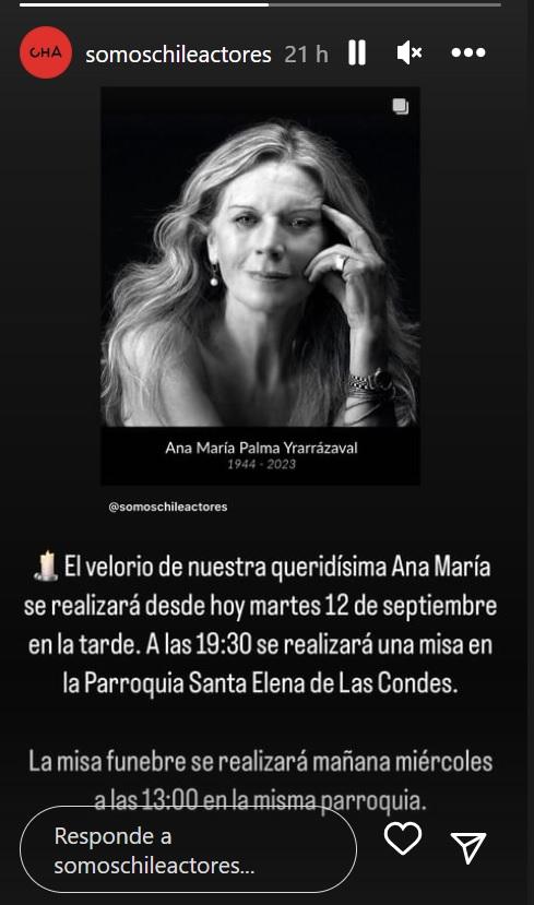 “Con mucha pena lamentamos comunicar el sensible fallecimiento de nuestra queridísima compañera y socia Ana María Palma”, escribió Chile Actores, la entidad encargada de comunicar el deceso, en sus principales redes sociales.