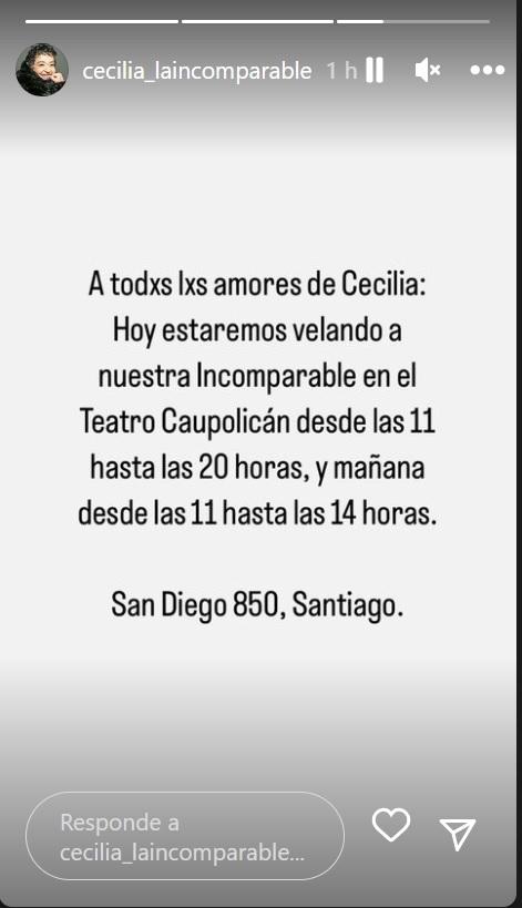 “A todos los amores de Cecilia. Hoy (25 de julio) velaremos a nuestra incomparable en el Teatro Caupolicán desde las 11 hasta las 20 horas. Y mañana (26 de julio) desde las 11 hasta las 14 horas. San Diego 850, Santiago”, informaron.