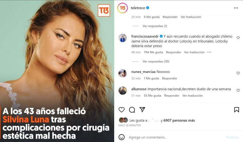 Pancho Saavedra rápidamente reaccionó a la muerte de Silvina Luna por las negligencias del médico argentino. Dejó un comentario en el Instagram oficial de T13.