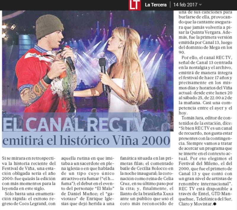 6- El Canal RECTV emitirá el histórico Viña 2000 (La Tercera)